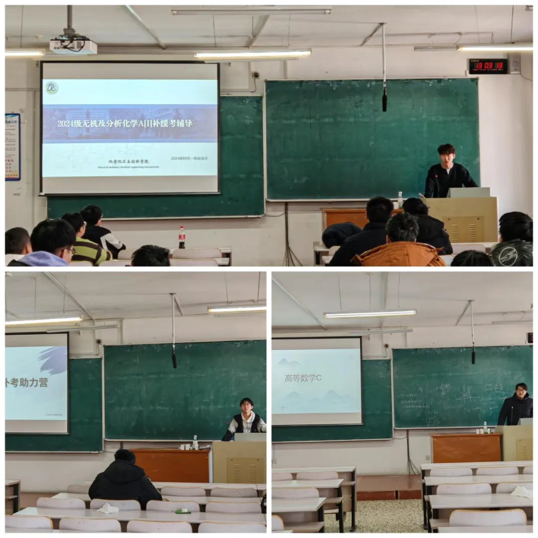 为进一步加强学院学风建设工作,顺利帮助挂科同学通过补考,找准复习重点。化学化工与材料学院于 3 月 8 日下午13:00在汇文楼566开展学业帮扶—考前重点辅导活动,本次活动邀请到学院2024级各专业课程成绩最高分的优秀学生代表担任《高等数学B》、《高等数学C》和《无机及分析化学》三门课程的主讲人,学院各年级相应科目挂科学生全部参与。