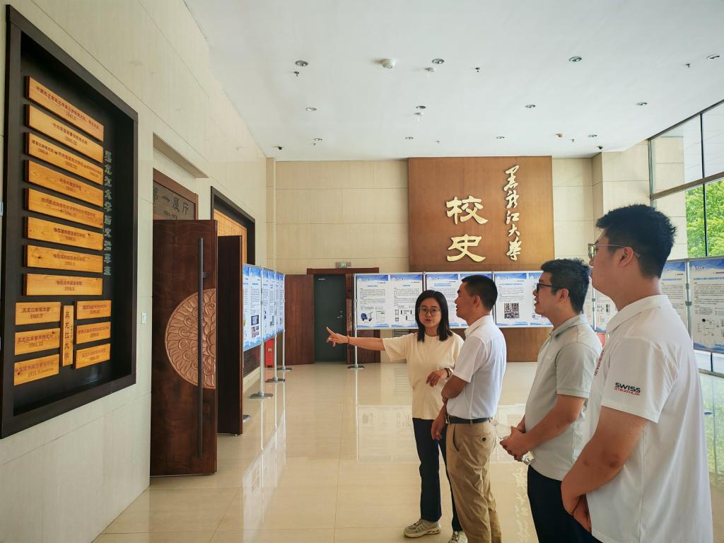 启动仪式结束后,曲阳老师带领江苏信步新材料科技集团一行实地参观重点实验室。曲阳老师结合党员科研团队负责的项目进展,细致讲解前沿研究的技术路径,特别介绍了党员教师在成果转化中“啃硬骨头”的实践案例。随后,在化学化工与材料学院党委副书记贾彩鑫的陪同下,企业人员走进校史馆。贾彩鑫书记围绕馆藏中体现党组织领导学校发展的文物史料,讲述学校在党组织带领下的发展节点、学科建设传承创新,生动展现了党组织引领下积淀的学术底蕴与人文精神,为双方深化合作筑牢了“红色文化认同”基础。