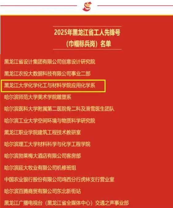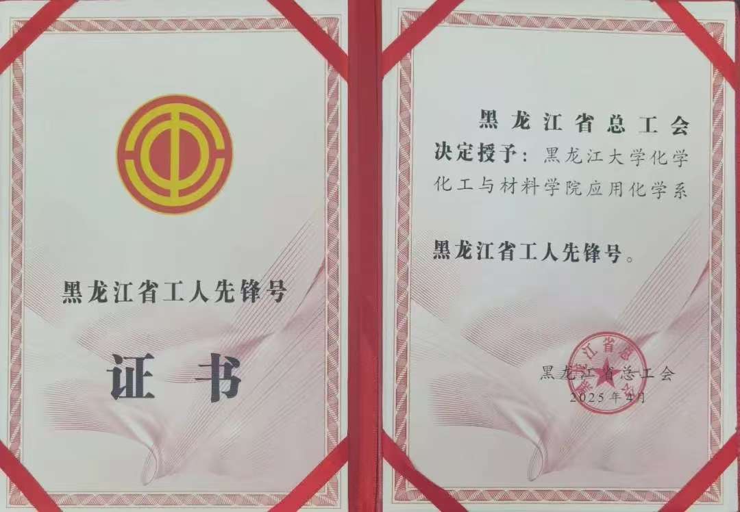 近日,黑龙江省总工会发布了《黑龙江省总工会关于表彰2025年黑龙江省五一劳动奖状、奖章(巾帼标兵)和工人先锋号(巾帼标兵岗)的决定》,化学化工与材料学院应用化学系获2025年黑龙江省工人先锋号(巾帼标兵岗)殊荣。