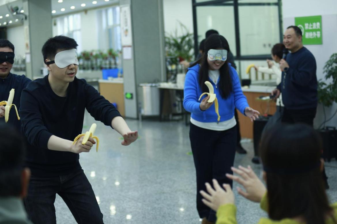 随后,“蒙眼吃香蕉”、“太空漫步”、“蒙眼过河”、“耳疾手快”等互动游戏轮番登场。老师们纷纷投身其中,个个热情饱满、活力十足,爽朗的笑声、欢快的呐喊此起彼伏,整个会场暖意融融、热闹非凡。这场趣味横生的游戏环节,一举将现场氛围推向沸腾高潮,不仅有效锤炼了团队协作意识与奋勇争先的昂扬斗志,更勾勒出轻松愉悦、温馨和谐的共事图景。大家在你来我往的互动中褪去工作辛劳,在并肩协作中凝聚同心合力,深厚情谊在欢声笑语中愈发醇厚。