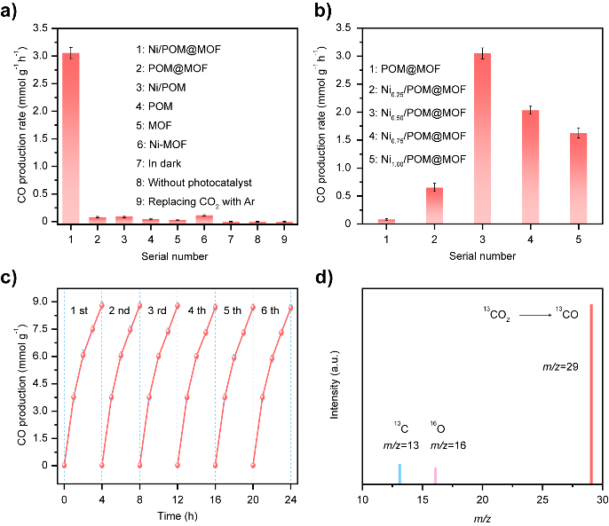在明确Ni-SAEB对级联电子转移的促进作用后,研究团队进一步对Ni/POM@MOF材料的光催化CO2还原性能开展系统评估,重点考察了复合材料各组成单元(Ni/POM、MOF)、原始POM及Ni-MOF的光催化CO2还原能力。性能测试结果表明,Ni/POM、MOF等单一组分的光催化活性均较低;即便组装形成POM@MOF复合材料,其催化性能仍未得到显著提升。为排除非光催化因素干扰,研究团队同步开展暗反应测试及对照实验(包括无光催化剂体系、氩气替代CO2体系),结果进一步证实该体系的CO2还原反应为光催化驱动过程。关键性能差异体现在Ni-SAEB的引入:仅当形成含Ni-SAEB的Ni/POM@MOF复合材料时,体系的光催化CO2还原效率才实现显著跃升。其中,Ni0.5/POM@MOF在气液反应体系中表现出最优催化性能,CO生成速率高达3 mmol·g-1·h-1,CO选择性95%。(图4)