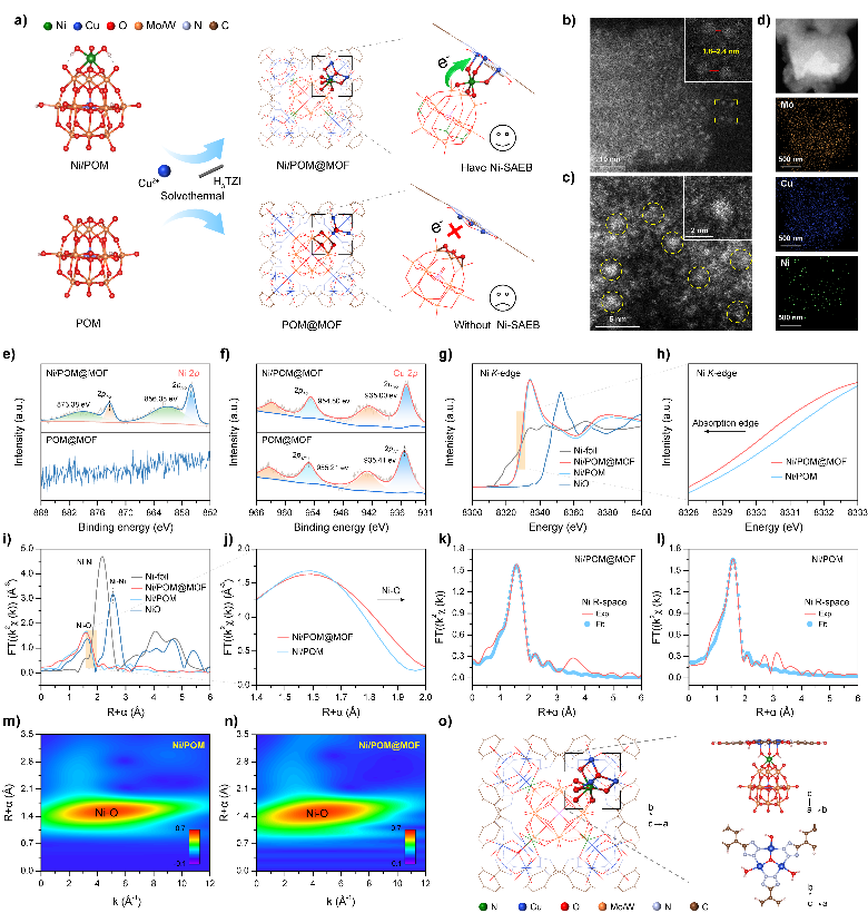 研究团队采用分步精准制备策略构建目标复合材料:首先选用Keggin型POM(PMo11W)作为前驱体,完成单原子Ni的初始锚定;随后通过“瓶中船”策略将Ni/POM封装于rht-MOF-1的笼状空腔内,实现Ni/POM的进一步分散。在此过程中,单原子Ni位点发生重新配位,形成Ni单原子电子桥(Ni-SAEB),成功在POM与MOF之间构建高效电荷传输桥梁,最终制备得到Ni/POM@MOF复合材料。表征结果证实了制备策略的有效性:球差校正高角度暗场扫描透射电子显微镜(AC-HAADF-STEM)观测显示,Ni/POM在不同尺度下均保持均匀分散状态;实测相邻Ni/POM颗粒间距为1.8~2.4 nm,与rht-MOF-1结构中相邻笼状空腔(C-cages)的2.2 nm间距完全匹配。这一尺寸吻合特性直接证实,Ni/POM已成功锚定于MOF通道内并实现有序纳米级分散。XPS分析不仅证实了Ni物种的成功引入,还揭示Ni-SAEB的形成可驱动Ni与Cu之间构建内部电场,进而推动电子向Cu位点定向转移。Ni/POM与Ni/POM@MOF的XANES谱图明显区别于Ni箔和NiO,表明镍负载后呈现独特的电子态。尽管二者的白线强度相似,但Ni/POM@MOF的白线能量向低能方向偏移了1 eV。该位移归因于Ni/POM@MOF中形成的Ni-SAEB结构,Ni-SAEB的形成促进了来自POM的电子转移,从而增加了Ni表面的电子密度。FT-EXAFS分析进一步证实,Ni在Ni/POM与Ni/POM@MOF中均以单原子形式存在。相较于Ni/POM,Ni/POM@MOF中Ni-O键长显著伸长0.03~0.05 Å:FT-EXAFS拟合结果显示,Ni/POM中Ni的平均配位数为6.0、键长为2.03 Å;采用相同拟合策略分析Ni/POM@MOF,其Ni配位数仍为6.0,但Ni-O键长增至2.05 Å。这一结构变化表明,Ni/POM@MOF的形成过程伴随Ni-SAEB的生成,单原子Ni与MOF骨架间的键合作用是导致Ni-O键伸长的核心原因。(图1)