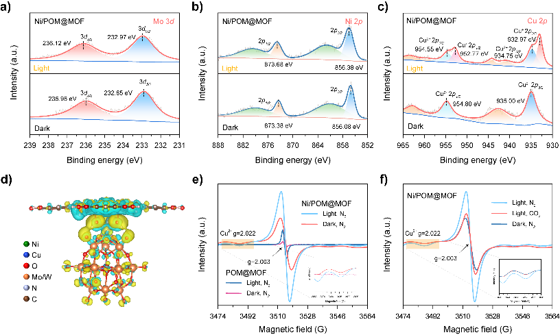 为精准阐明电子转移路径的方向与归宿,研究团队通过原位表征技术开展系统研究,明确了Ni/POM@MOF复合材料中的电子流方向。In situ XPS测试证实,电子可从POM定向转移至MOF框架中的Cu位点,同时检测到Cu2+向Cu+的还原信号,这一特征直接佐证光生电子最终富集于Cu催化活性位点。作为对照,缺乏Ni-SAEB的POM@MOF体系虽存在相似的电子转移趋势,但电子转移效率显著偏低,Cu的局部化合态未见明显变化;气氛条件下In situ EPR测试同样检测到Cu2+向Cu+的转化信号,进一步凸显了Ni-SAEB在促进级联电子转移、提升Cu催化位点电子密度中的核心调控作用。当体系中引入CO2时,可观察到Cu2+信号的部分恢复,这一现象表明电子可从Cu位点进一步转移至CO2分子,进而触发CO2的后续还原反应进程。(图3)