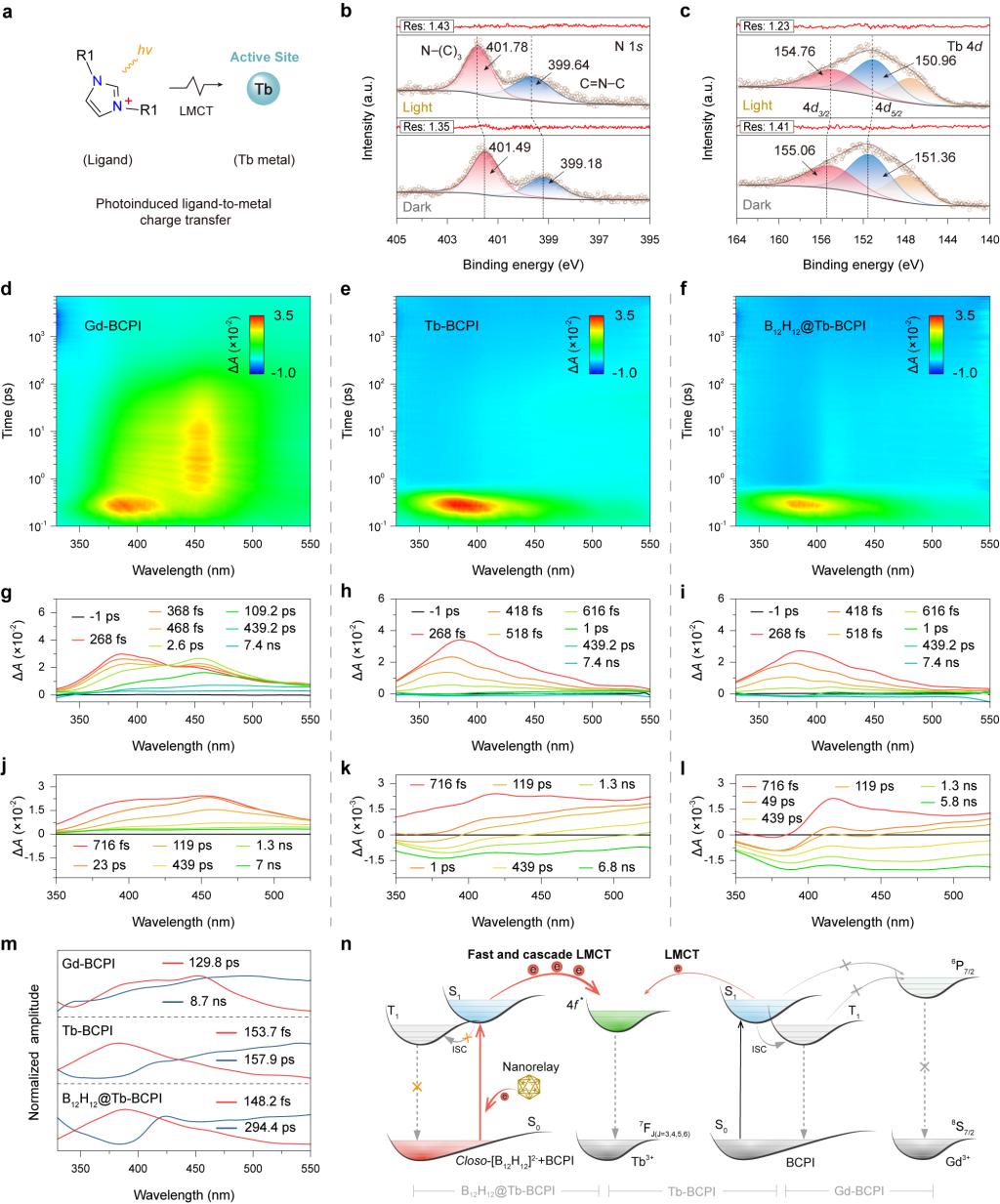 在明确了纳米继电器的电子传递功能后,团队进而利用飞秒瞬态吸收光谱(fs-TAS)这一超快“显微镜”,深入探究了其如何从动力学上增强LMCT过程。通过对fs-TAS数据进行全局拟合和动力学分析,团队发现B12H12@Tb-BCPI中从配体S1态到Tb3+的电子注入时间常数(τ1)仅为约148.2飞秒,比Gd-BCPI中S1态的寿命快了近三个数量级。尤为重要的是,这一过程甚至比未修饰的Tb-BCPI更快,且后续的电荷分离寿命(τ2)更长。这一关键发现表明,closo-[B12H12]2-的引入不仅显著加速了最初的电子注入步骤,还通过其自身的空间位阻效应有效抑制了注入电子的回传与复合,从而为表面催化反应提供了更充足的光生电子和更长的反应时间窗口,这是实现高效光催化的决定性动力学因素。(图4)