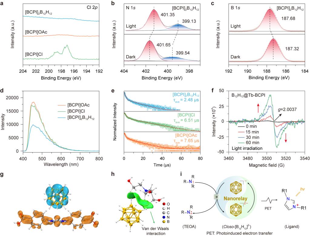 为了从分子层面彻底厘清纳米继电器的工作机制,研究团队合成了系列具有不同阴离子的配体盐模型化合物,并开展了系统的对比研究。光物理与光电子能谱分析清晰地表明,只有含有closo-[B12H12]2-的模型化合物在光照下表现出显著的动态电子转移特征,其N 1s和B 1s的XPS结合能发生可逆位移,并伴随有特征性的自由基信号在EPR谱中出现。进一步的瞬态荧光测试发现,硼簇的引入显著淬灭了配体的荧光并缩短了其激发态寿命,这表明一条高效的非辐射电荷转移通道被成功开启。为了直观展示这一过程,团队采用了密度泛函理论进行计算,其得到的空穴-电子分布图明确显示,光激发后,空穴主要定域在电子给体closo-[B12H12]2-簇上,而电子则集中在作为电子受体的H2BCPI+配体上,形成了空间分离,令人信服地揭示了纳米继电器作为“电子中转站”的核心功能。(图3)