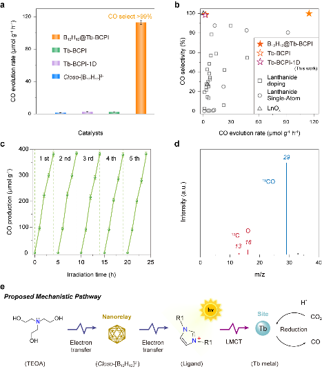 在光催化CO2还原的性能评估中,B12H12@Tb-BCPI复合材料展现出了令人瞩目的催化活性和卓越的运行稳定性。在模拟太阳光照射下,其CO生成速率是未修饰的一维前驱体Tb-BCPI-1D的138倍。证明了closo-[B12H12]2-纳米继电器是性能提升的核心关键。当我们将该材料的性能置于更广阔的视野下,与近年来报道的其他各类镧系基光催化剂进行横向比较时,B12H12@Tb-BCPI在CO产率和对CO产物的选择性两方面均展现出绝对的领先优势,凸显了本策略的独特性和有效性。(图2)