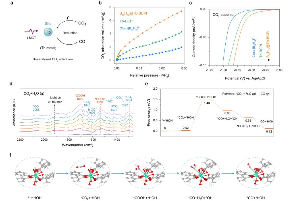 最终,研究的焦点落在了CO₂分子在活性位点上的吸附与活化这一催化循环的最终环节。团队采用了原位DRIFTS技术,在光照条件下成功监测到了从CO2吸附、到COOH关键中间体的形成、最终至CO产物产生的完整动态演变谱图。理论计算则从能量和原子层面提供了完美的补充:差分电荷密度分析直观展示了CO2吸附后,电子从Tb位点持续流向CO2分子的过程,实现了对CO2的活化;而吉布斯自由能计算则清晰地描绘出整个反应路径,指出COOH的形成是反应的决速步骤,并且*CO的脱附在能量上远优于其进一步加氢生成CH4的路径,从理论上完美解释了实验观察到的近100% CO选择性(图5)。