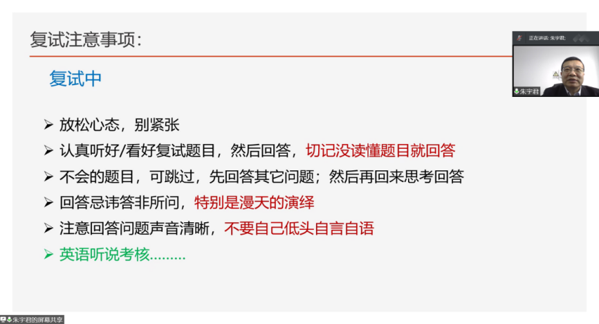 会议伊始,朱宇君教授从复试形式与内容、复试注意事项等方面进行细致讲解。他强调,对于是否采取线上形式进行复试,同学们一定要做好两手准备,防止客观因素影响复试成绩。在面试中应注重调整紧张心态,遇到不解之处要积极思考,避免答非所问。同时,朱宇君教授建议参加复试的同学们要注意夯实自身专业基础,提高自身综合素养,合理利用学校资源,加强和老师的沟通交流,以求在复试中取得好成绩。