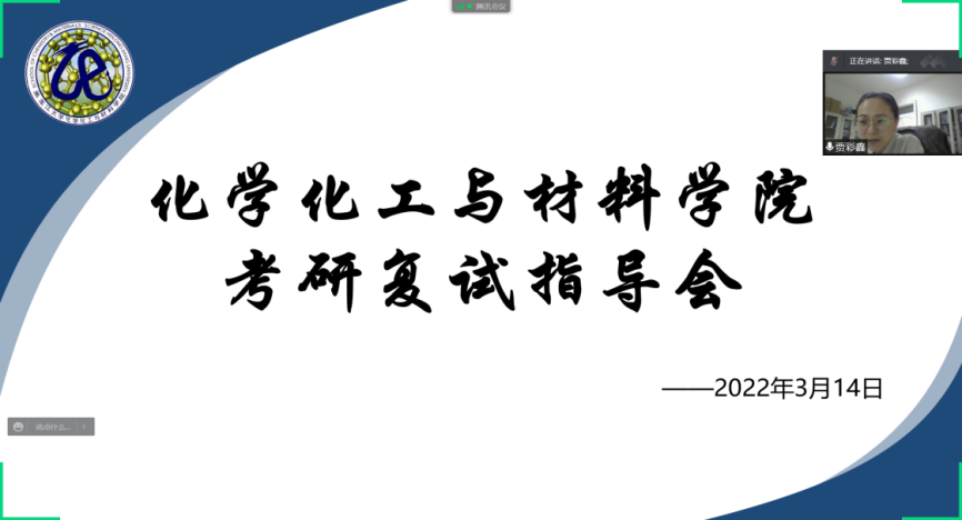 为持续推进考研工作顺利进行,扎实做好考研跟踪服务工作,助力学院考研学子从容面对复试,化学化工与材料学院于2022年3月14日13:30组织召开考研复试指导会,本次指导会由学院党委副书记贾彩鑫主持,学院朱宇君教授、邹金龙教授担任主讲嘉宾,学院部分2022届毕业生参加会议。