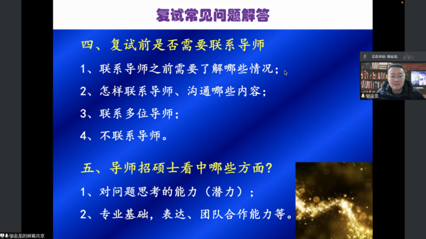 随后,邹金龙教授从专业课复试准备、英语复试准备及复试常见问题三方面进行讲解。此外,他提醒同学们应注重提升自身的专业知识与学科素养,有针对性地加强实验操作和技能。邹金龙教授向同学们提出寄语,停下休息的时候不要忘记别人还在奔跑,希望同学们摆平心态,查漏补缺,做好复试的准备,充分展示自身优势,以最好的状态去面对接下来的挑战。