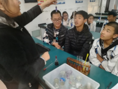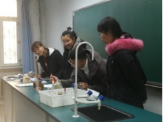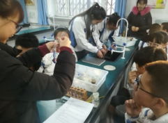 八年级的同学已经开始学习化学,对化学学科也有浓厚的兴趣,十分欣喜我们的到来。考虑到实验的安全性志愿者们选择了几个安全、简单、现象明显的实验向同学们展示。利用高锰酸钾和浓硫酸让酒精灯芯燃起火焰的瞬间,同学们无比惊讶;颜色反应由志愿者们和同学一同完成,一边讲原理一边规范操作,试管中的颜色变化让大家轻松记住了石蕊试液的作用;借助醋酸和小苏打冒出的泡沫,志愿者们对生活中的现象进行科普。整节课,同学们积极回答问题,认真观察实验现象,举一反三,并在下课之前完成了化学老师布置的实验报告。