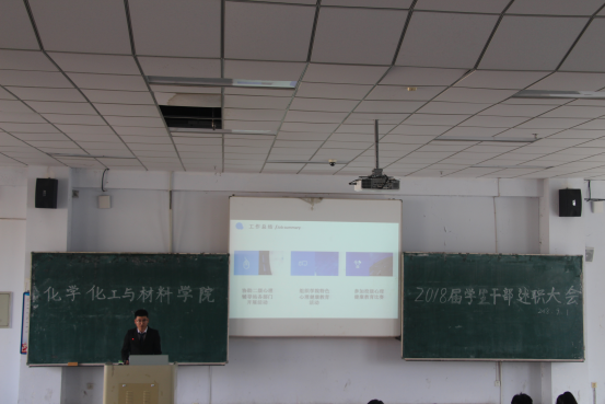 为了对学院学生组织的各项工作做出及时反馈,对各部门的工作做出有效考核,化学化工与材料学院团委于2018年9月1日13时,在汇文楼120组织召开2018年学生干部述职大会。本次大会邀请了化学化工与材料学院党委副书记、副院长朱清桃老师,团委书记贾彩鑫老师,团委副书记温尔斯格老师,团委副书记刘京强老师,助理辅导员王万茹、李鸿欣。