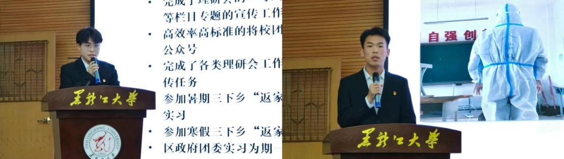 随后,2021级优秀学生于松洋和2020级优秀学生朱孝联结合校院两级学生工作、志愿服务经历与同学们展开分享,他们以积极投身学生工作,勇立潮头的热情,以服务奉献发挥学生干部本色的精神,向学院同学们诉说青春无悔和责任担当。从干事到部长,再到组织的领导者,他们告诉同学们,责任越大,信念越坚,要加强对学习成绩的关注度,加强学生工作和人际关系的平衡和思考,协调好三者之间的时间分配,努力丰富自己的校园生活。