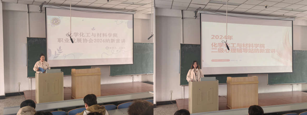 为了更好宣传我院各学生组织,帮助2023级同学进一步了解各学生组织的职能,让同学们选择加入适合自己的学生组织,化学化工与材料学院于2024年3月10日下午14:00组织召开学生组织纳新宣讲会。本次会议由学院团委组织部长宋杨阳主持,各学生组织主席进行宣讲,各学生组织主要成员及2023级部分同学共同参加了本次宣讲会。