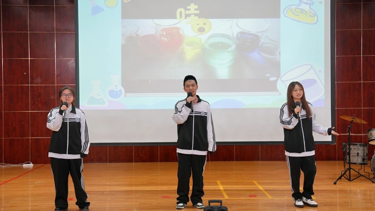 时间推移,光影转换。活动来到了趣味合唱环节,由李佳桐、张馨予、范佳奇同学带来的《化学元素周期表》,不仅仅是对化学奥秘的探索,更是将我院特色展现给全体观众。