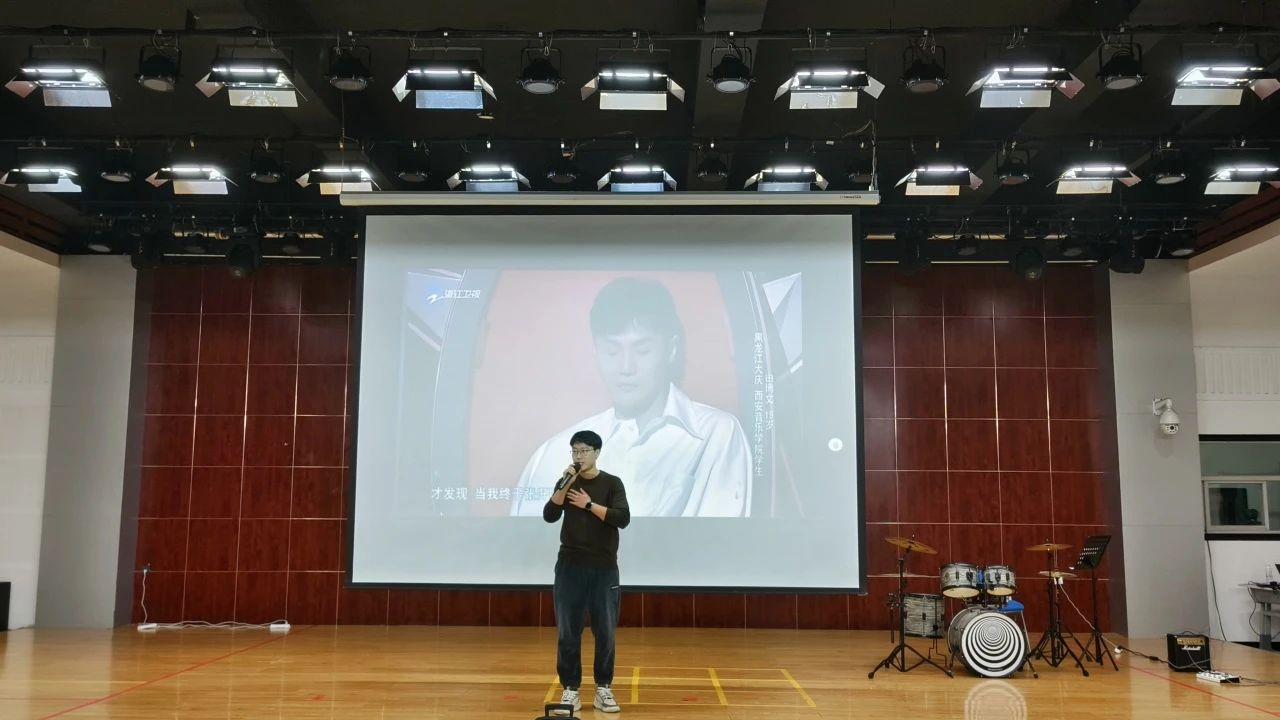 由研究生代表王雨松带来的歌曲独唱《Simon》,歌曲体现了现代青年即使在快节奏生活中面临许多孤独迷茫,也同样保持着自己对梦想的坚毅追求。