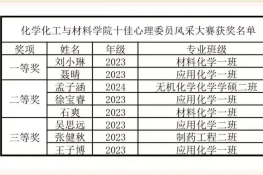 为全方位筑牢学校心理健康教育四级工作网络体系,深度激发心理委员在朋辈互助中的核心效能,系统化提升其心理服务专业能力,切实守护大学生心理健康防线,学生工作部心理健康教育中心以第二十二届“3·25-5·25”大学生心理健康教育宣传月为重要契机,精心打造“朋辈携手,心路同行”十佳心理委员风采大赛。我院学子积极响应、踊跃参赛,凭借扎实的专业知识储备与昂扬的精神姿态,生动展现了化学学子在心理健康教育实践中“育心更育人”的卓越风采与使命担当。