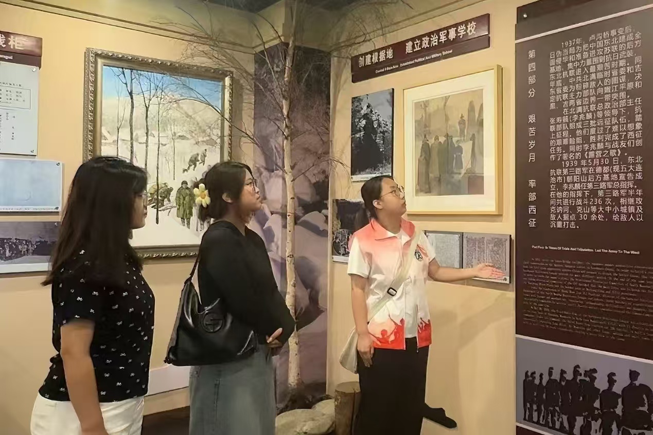 在“艰苦岁月,率部西征”展区中,志愿者们化身为革命歌曲《露营之歌》的“传唱人”,志愿者的歌声中歌颂着东北抗联战士坚定的信念,以及与法西斯侵略者顽强抗争的革命精神,让观众们更能体会到和平的珍贵,也让我们对英雄们的牺牲奉献充满敬意。
