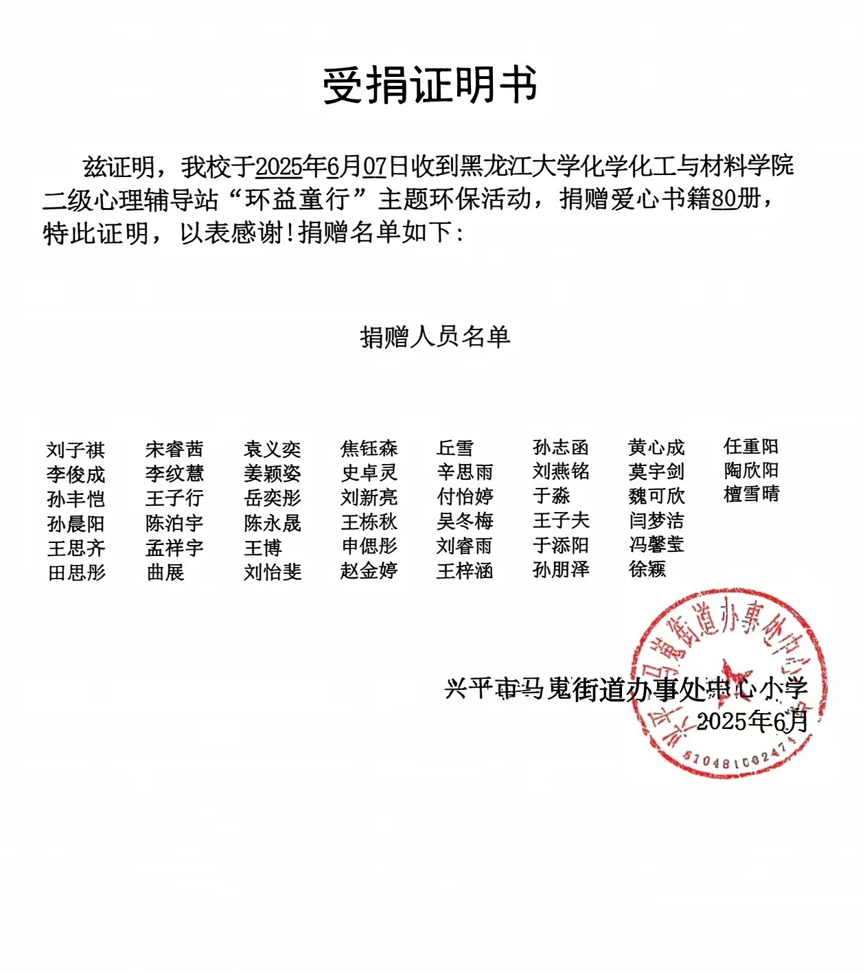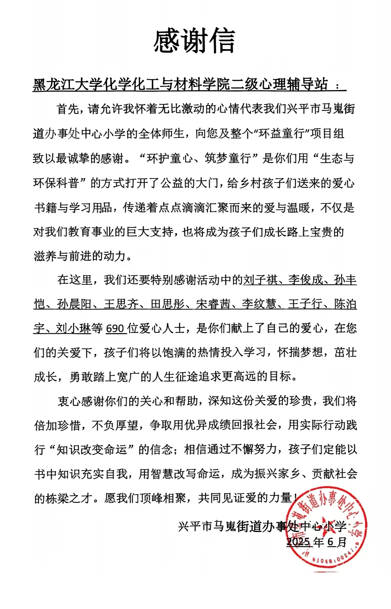 为守护留守儿童心灵成长,传递社会温暖力量,5月18日至29日,黑龙江大学化学化工与材料学院二级心理辅导站联合“环益童行”项目组,共同开展“心手相牵,童心生花”公益主题活动,近700名学子踊跃参与。活动以关爱留守儿童为核心,通过丰富多元的帮扶形式,为孩子们照亮求学之路,让他们真切感受到社会各界的关怀与温暖。同时,致力于为留守儿童打造更优质的成长环境,让知识浸润心田,助力他们在成长道路上坚定信念、勇敢逐梦,绽放独特光彩。