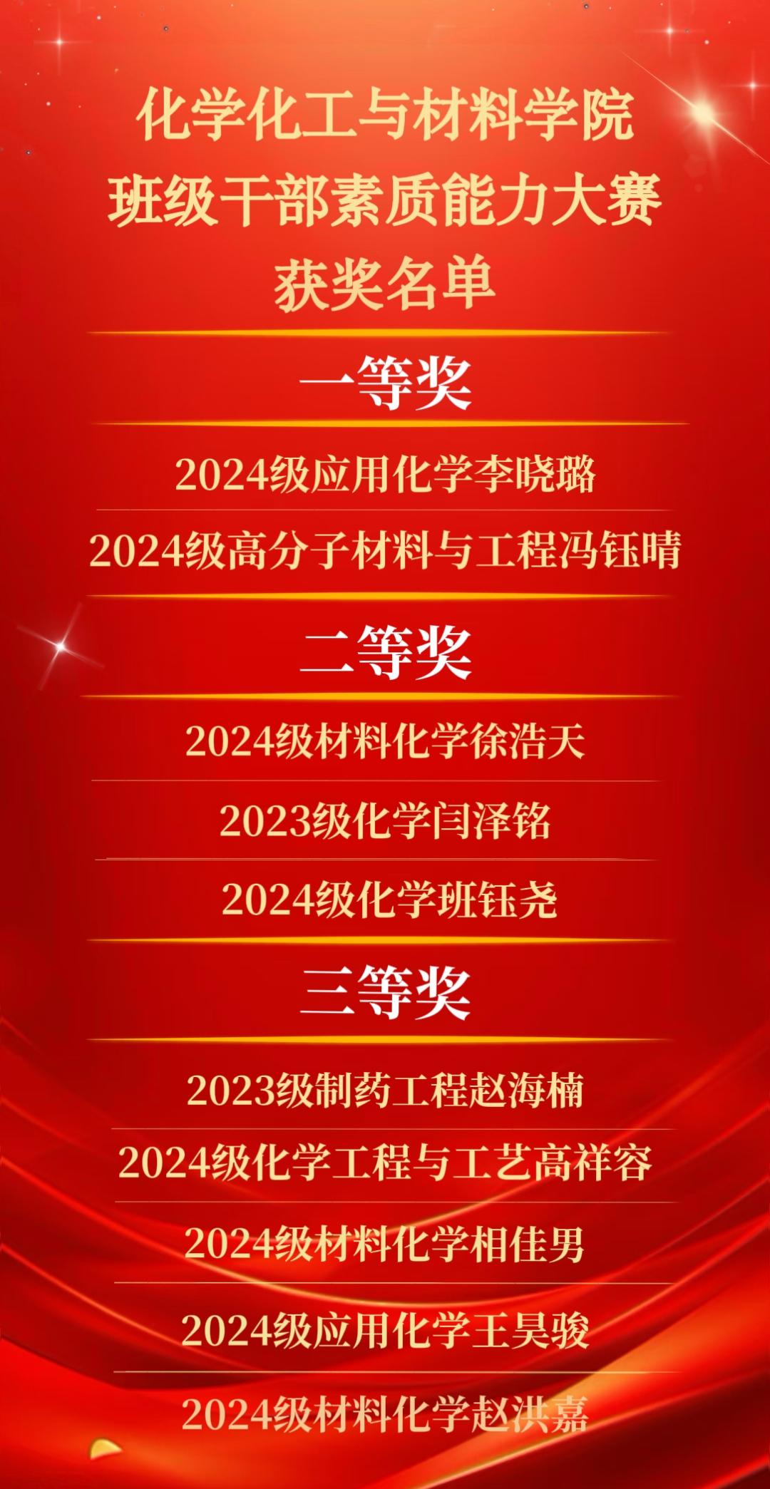 本次初赛面向化学化工与材料学院全体2022级、2023级、2024级班级干部开展,同学们踊跃参加,现根据各参赛选手得分情况,本次“班级干部素质能力大赛”初赛获奖结果如下: