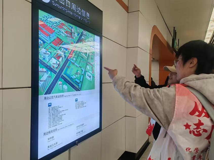 在售票机前,志愿者们主动迎向操作困难的游客,熟练演示扫码购票、异地票务处理;在闸机处,他们温馨提醒乘客提前准备乘车码,并为携带大件行李的旅客搭手助力;在站台层,面对外地游客关于“太阳岛景区哪个口出最近”、“冰雪大世界夏季开放吗”等多样化咨询,志愿者们化身“城市推荐官”,在指引路线的同时,也热情地介绍着冰城的夏日风情。