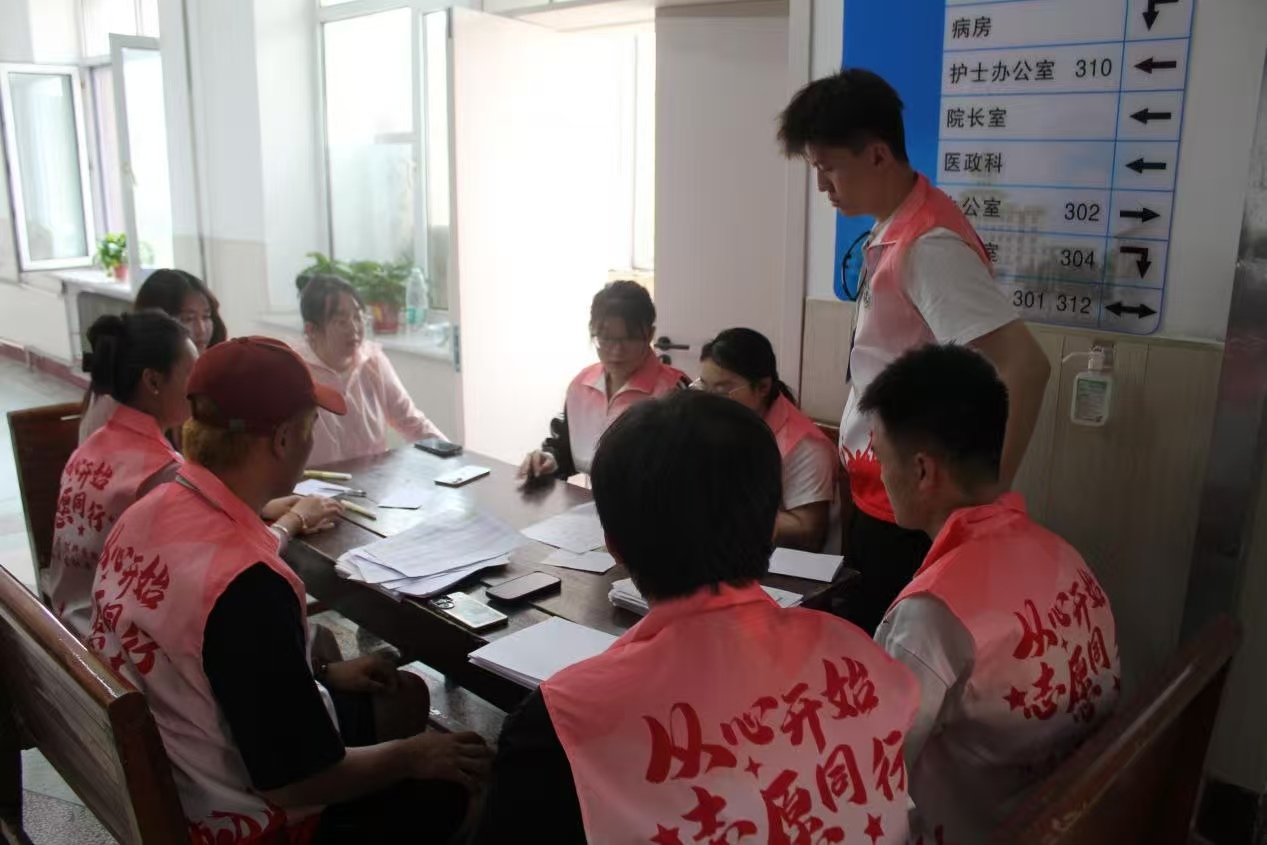 在志愿活动开始,邢宇佳老师就已拿着工作手册,围绕长桌向志愿者们部署任务。老师先明确分工,将志愿者分为引导组、协助组和资料整理组,每组职责和服务区域都标注在示意图上。接着重点强调注意事项,比如引导时要使用礼貌用语、遇到突发情况需第一时间联系医护人员、保护就诊师生的个人信息隐私。最后,老师逐一确认志愿者是否清楚流程,还现场演示了如何协助行动不便的师生,确保每个人都能高效投入服务。