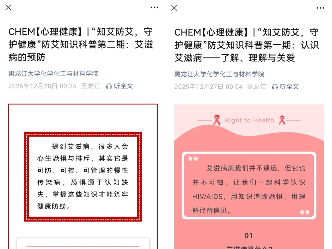 黑龙江大学化学化工与材料学院二级心理辅导站举办的“以笔为炬,点亮防艾微光”防艾故事续写征集活动圆满结束。活动以故事续写为创新形式,打破传统防艾宣传单向模式,累计收到20余份有效作品。同学们在创作中深化了对艾滋病的认知,也培养了同理心,减少了对患者的偏见与歧视,校园内形成“知艾防艾、关爱同行”的良好氛围。学院后续还将持续开展防艾宣传教育,让防艾理念常态化传播。