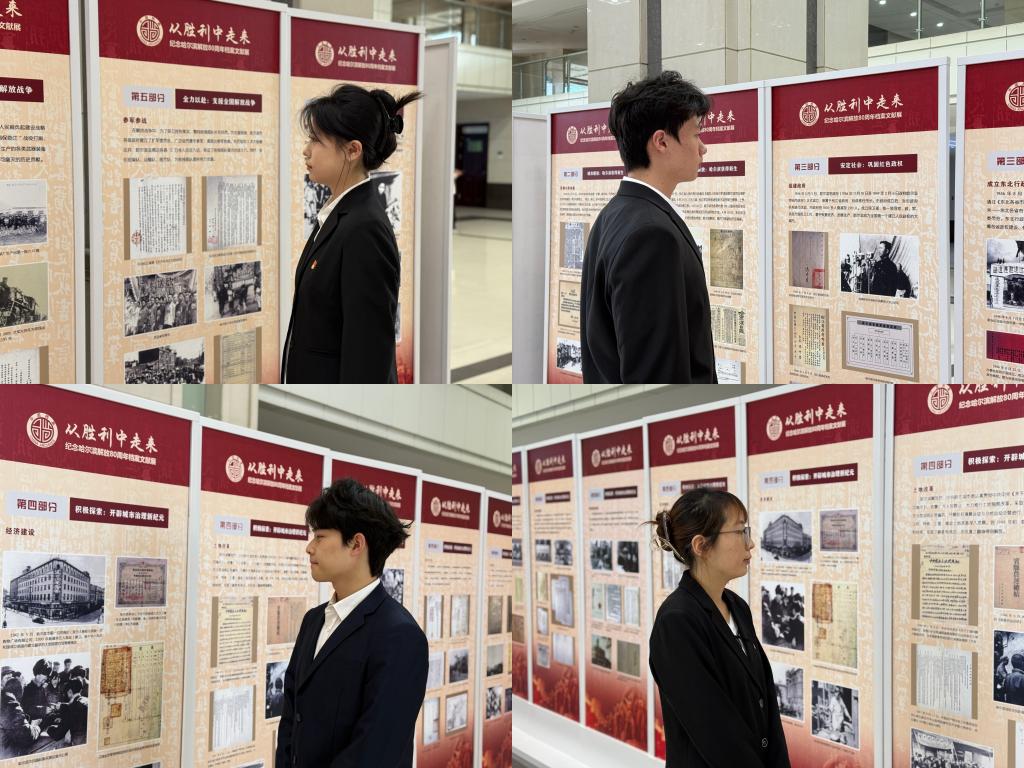 展览现场,同学们跟随展陈脉络回溯了哈尔滨从解放初期百废待兴,到支援全国解放、投身新中国建设的壮阔历程。从记录城市解放时刻的历史影像,到反映各界群众支援前线的档案资料,再到展现哈尔滨作为工业重镇支援国家建设的珍贵文件,一件件展品、一幅幅照片,生动还原了党领导人民治理大城市的开篇故事,让同学们真切感受到这座英雄城市的红色基因与奋斗底色。参观过程中,同学们不时驻足凝视、轻声交流,在历史细节中读懂哈尔滨的发展变迁,深刻体会到城市发展与国家命运的紧密联系。