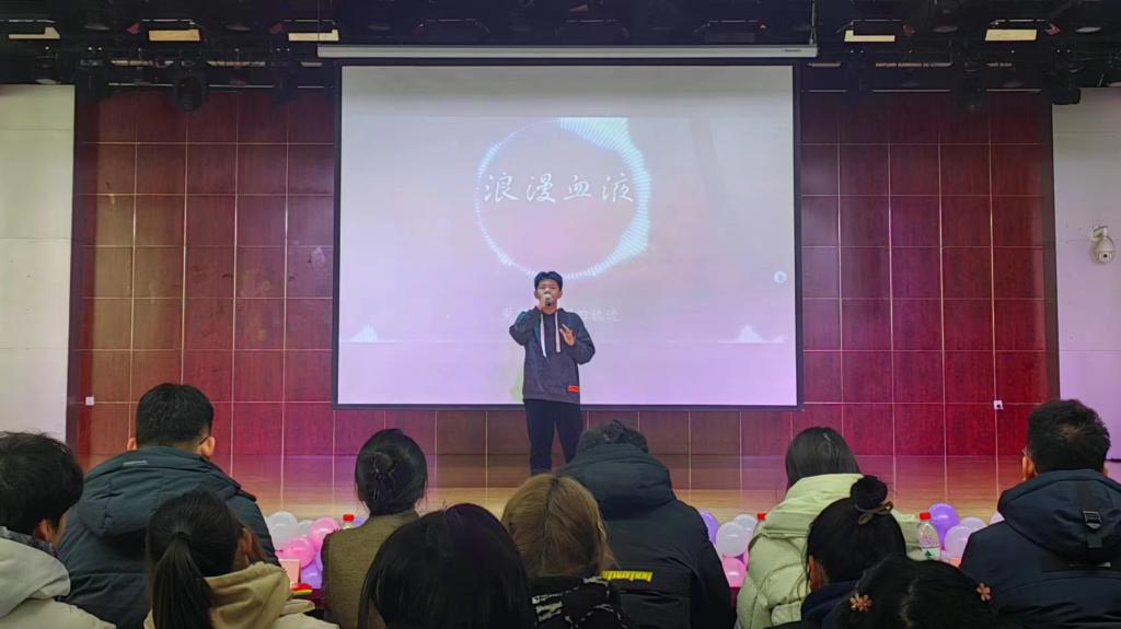 接下来,歌曲《浪漫血液》为本次团日活动拉开帷幕,台下同学们热情高涨,欢呼声此起彼伏,演唱者的歌声鼓励同学们当遇到问题的时候需要用爱去克服,用这种精神去掩盖负面情绪,为他人和自己带来正能量。