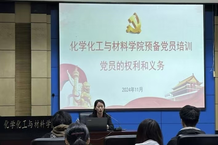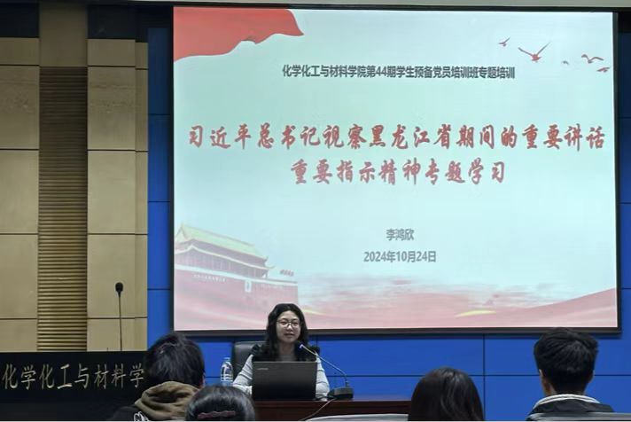 为深入学习贯彻党的二十大和二十届三中全会精神,进一步贯彻落实习近平总书记视察黑龙江期间的重要讲话重要指示精神,全面学习习近平总书记在2024年全国教育大会上的重要讲话精神,夯实学生党员先锋工程,引导广大学生党员进一步发挥先锋模范作用,激发爱党、爱国、爱校情怀,进一步巩固和深化学生党员“不忘初心、牢记使命”主题教育成果,激励广大学生党员勇担历史使命,充分展现先锋本色。按照《中国共产党发展党员工作细则》和《普通高等学校学生党建工作标准》要求,化学化工与材料学院于2024年10月24日组织开展第44期预备党员培训,第44期学生预备党员培训班全体学员参加。