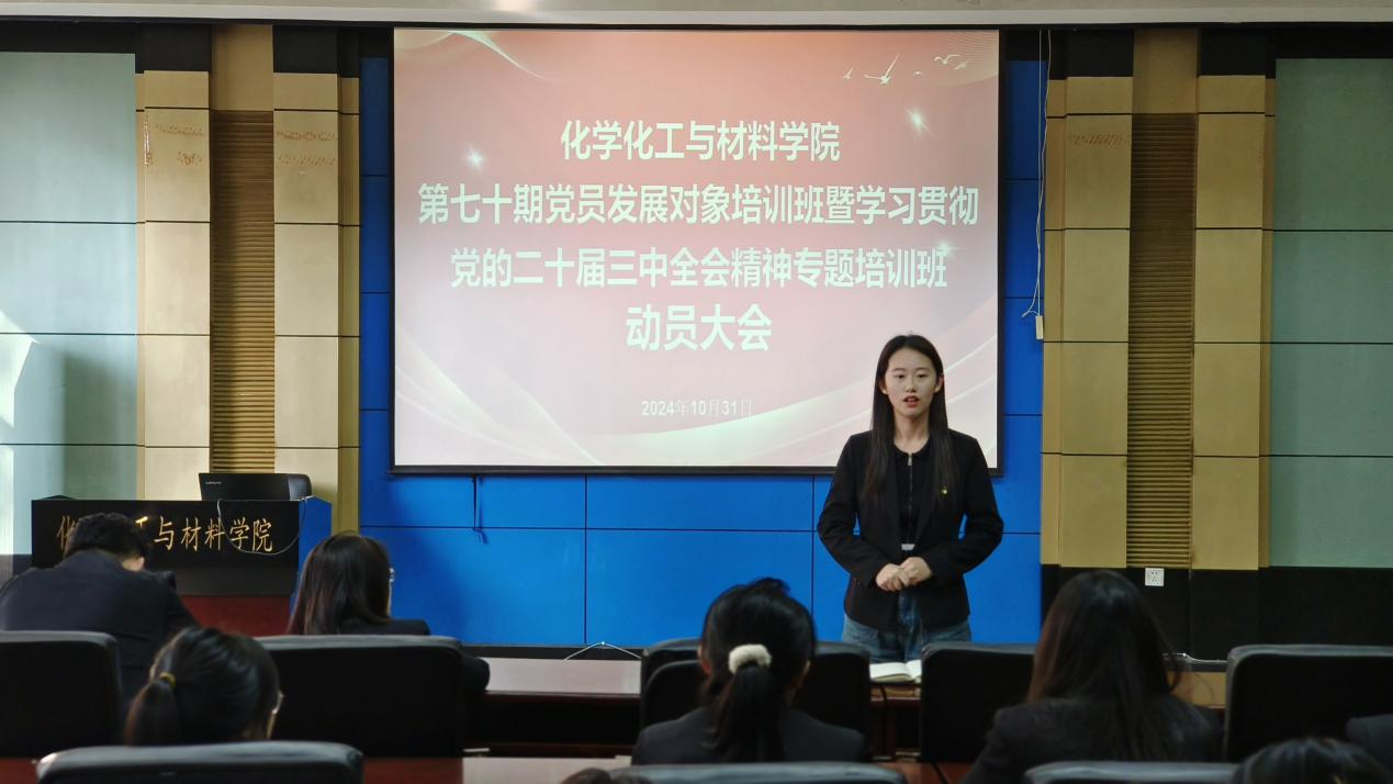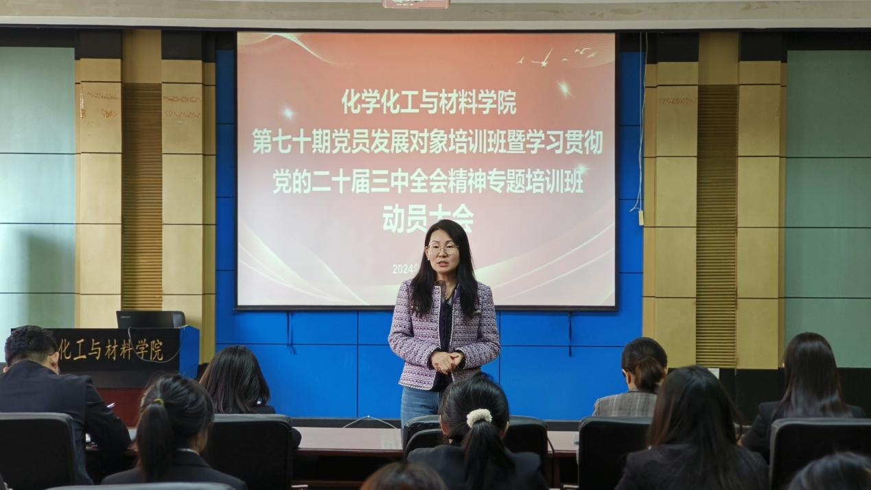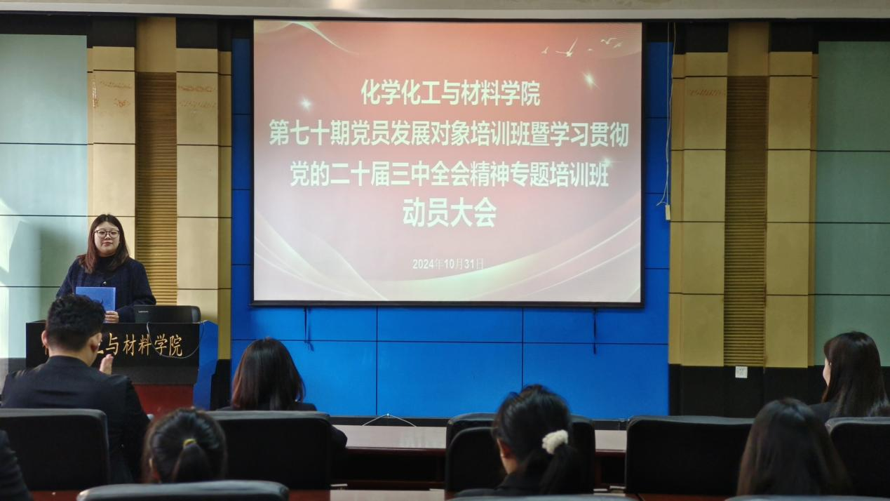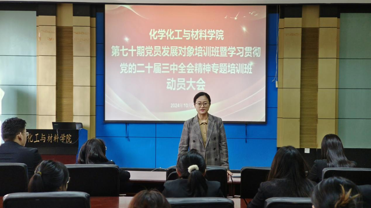 化学化工与材料学院党委于10月31日召开第七十期党员发展对象培训班动员大会。学院党委书记秦川丽、党委副书记贾彩鑫、组织员张晓密、团委副书记王增泽、团委副书记王欣及全体第七十期党员发展对象出席参加。大会由学院团委副书记史岚鑫主持。