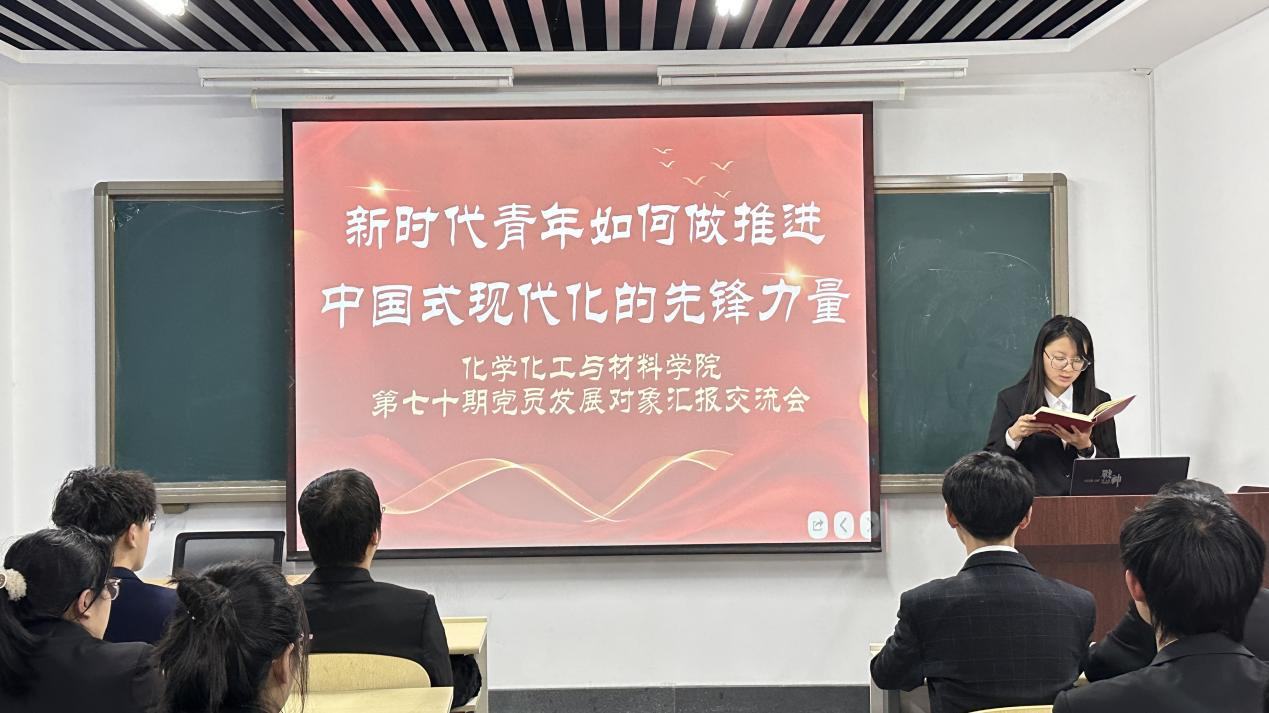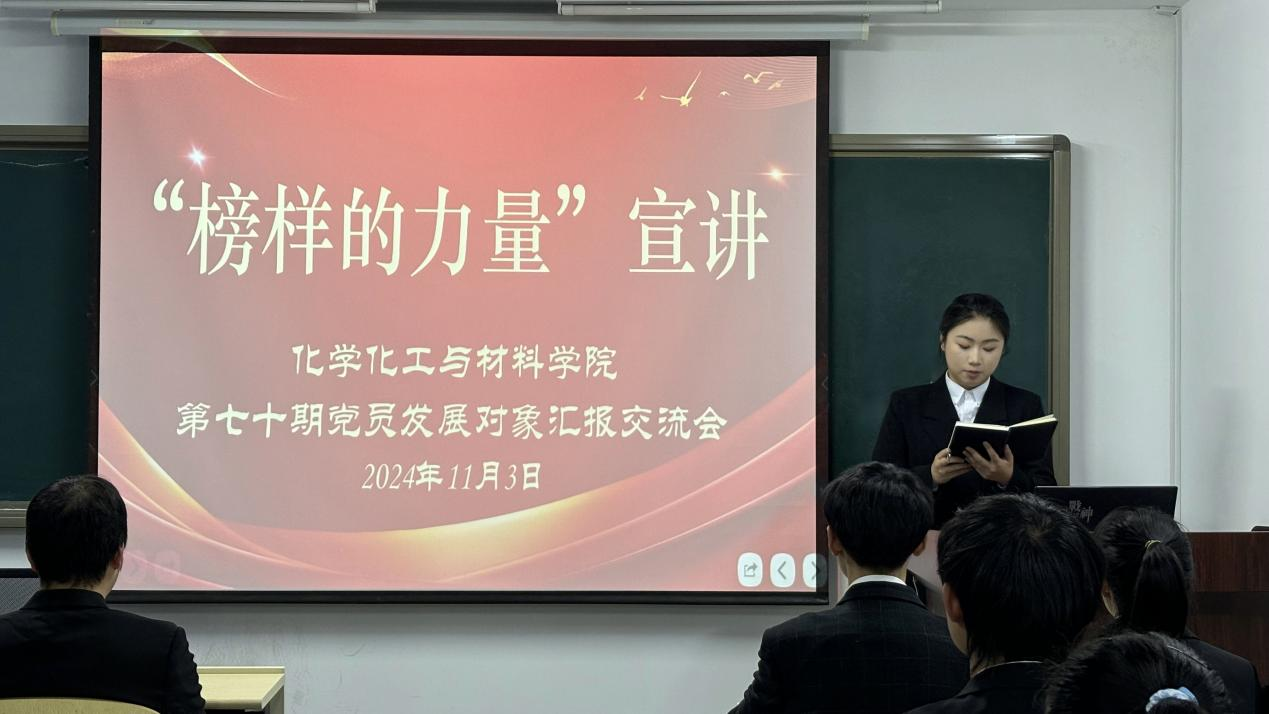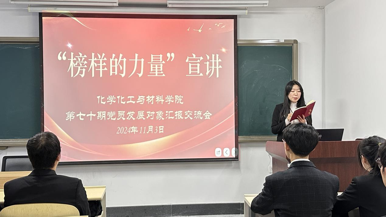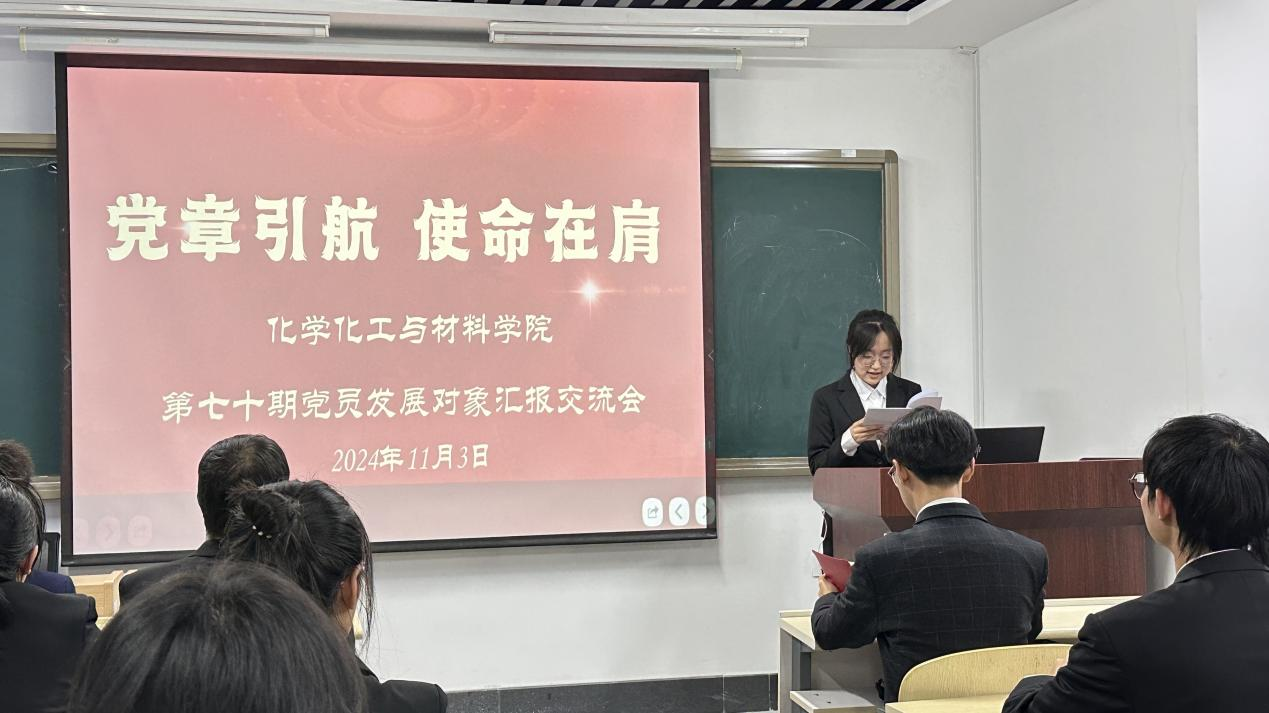 化学化工与材料学院党委于10月31日召开第七十期党员发展对象培训班动员大会。学院党委书记秦川丽、党委副书记贾彩鑫、组织员张晓密、团委副书记王增泽、团委副书记王欣及全体第七十期党员发展对象出席参加。大会由学院团委副书记史岚鑫主持。
