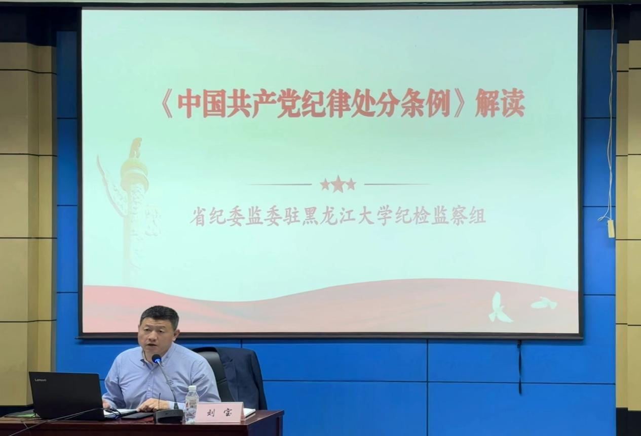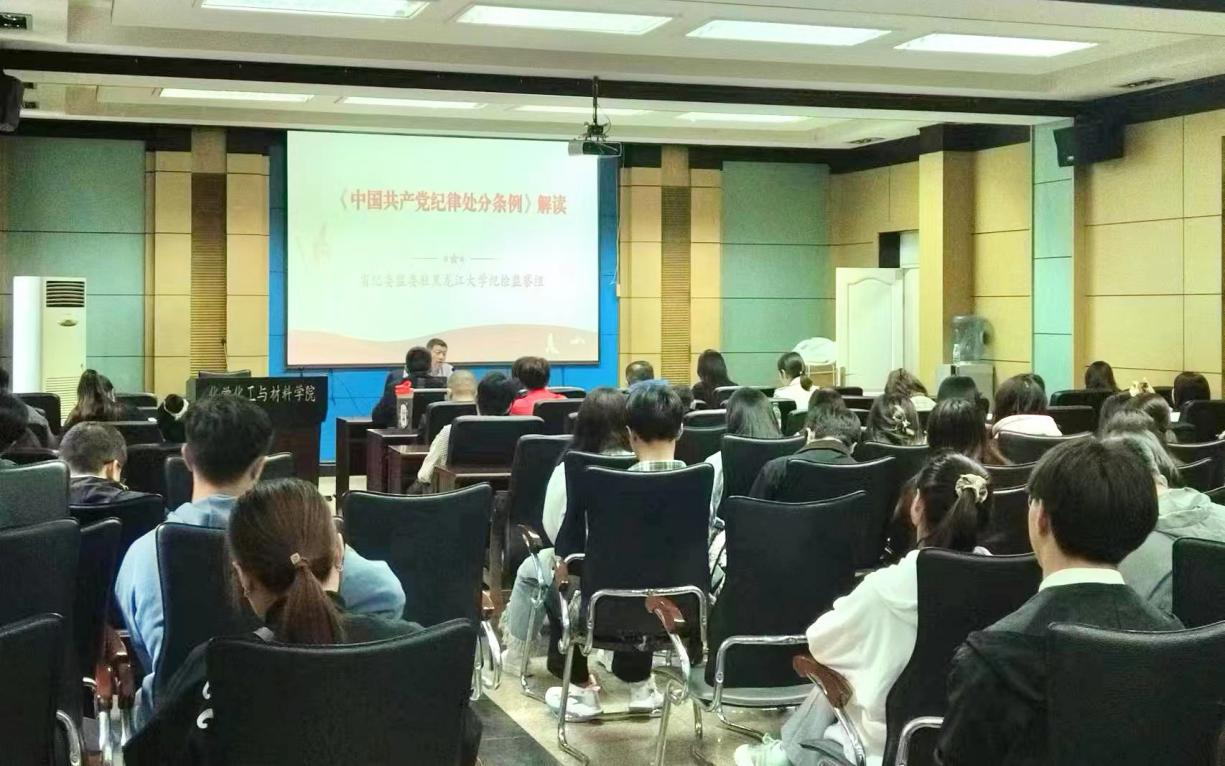 为深入学习贯彻习近平总书记关于党纪学习教育的重要讲话和重要指示精神,贯彻落实《黑龙江大学学习宣传贯彻〈中国共产党纪律处分条例〉(修订)的方案》,不断强化纪律意识,营造知党纪、守党纪的优良氛围,化学化工与材料学院党委于5月29日下午在化学楼大会议室召开党纪学习教育宣讲会,特邀请省纪委监委驻黑龙江大学纪检监察组副组长刘宝主讲,宣讲主题为《〈中国共产党纪律处分条例〉解读》。宣讲会由学院党委书记秦川丽主持,学院领导班子、党支部书记、师生党员代表参加。