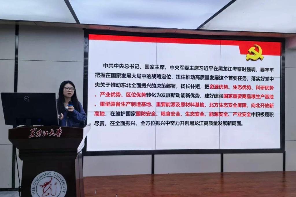 培训第二部分由学院团委书记李鸿欣主讲,带领学员深入学习习近平总书记视察黑龙江省期间的重要讲话和指示精神,同时强调新时代推动东北全面振兴座谈会精神和龙江优秀精神的重要性。李鸿欣老师从习近平总书记对黑龙江省经济发展、生态保护、民生改善等多方面的重要讲话入手,通过细致解读,让学员深刻认识到习近平总书记指示背后的深远意义和党员所肩负的责任与使命。最后,李鸿欣老师对学生党员们深切寄语,要将习近平总书记的指示精神内化于心、外化于行。在今后的学习、工作和生活中,以更高的标准要求自己,发挥先锋模范作用,用实际行动践行入党誓词,始终以党员的高要求、严标准约束自己,不负韶华,不负党和人民的期望,早日成为新时代优秀党员,为实现中华民族伟大复兴的中国梦贡献自己的力量。