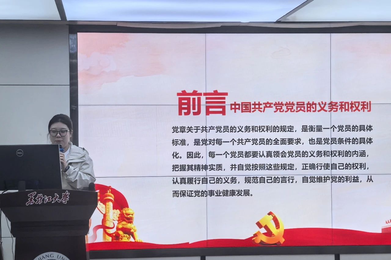 培训第三部分由学院团委副书记史岚鑫主讲,讲授中国共产党党员的权利和义务。史岚鑫老师紧扣《中国共产党章程》相关规定展开剖析,向全体预备党员详细解读党员八项义务的实质与意义。从学习党的理论方针、贯彻基本路线、坚持党和人民利益至上等义务,系统讲解党员需承担的责任,强调履行义务需全面、严格、自觉,立足本职岗位发挥先锋模范作用。同时指出党员应深入学习党章,提高理论知识和政治素质,牢记权利与义务的辩证统一,以党章为准则知行合一,笃行不怠。