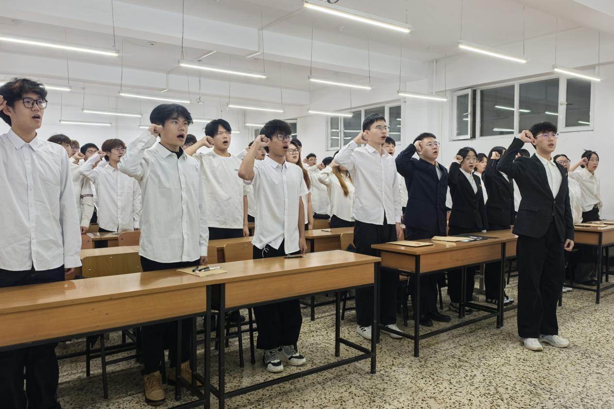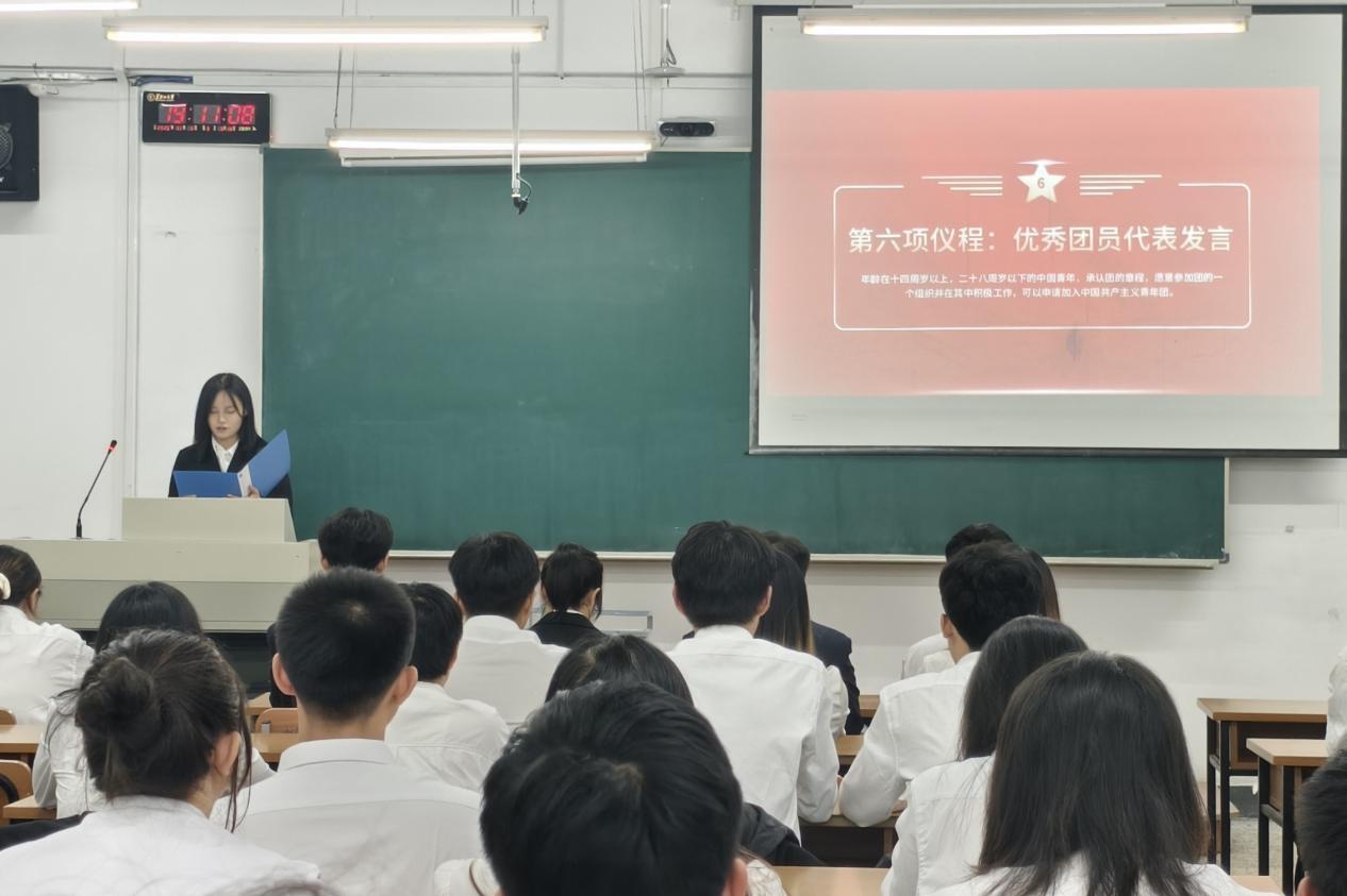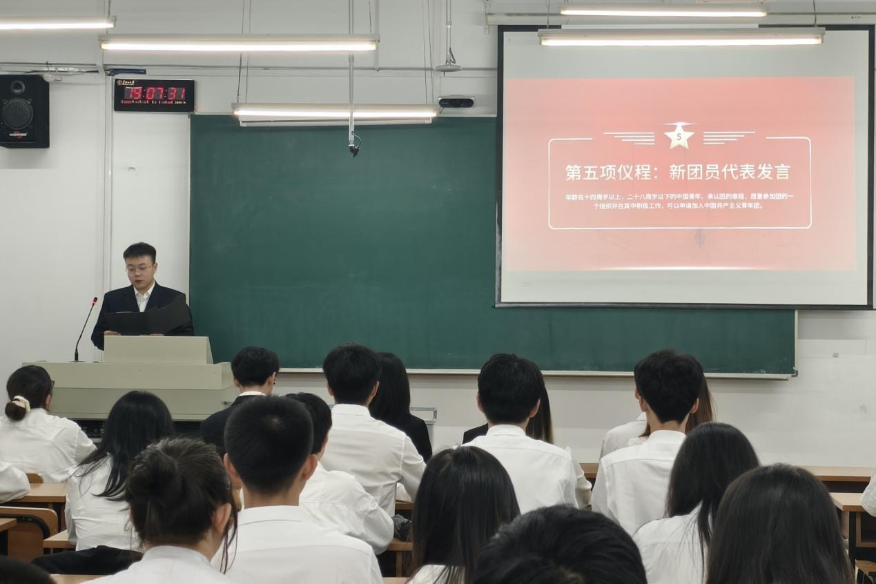 仪式正式开始,闫泽铭带领新团员回顾百年党史,激励大家追寻党的光辉足迹,践行共青团的使命与责任。随后,大会宣读经团组织培养考察合格的新团员名单,在庄严的团旗下,全体新团员起立,高举右拳,进行郑重宣誓。入团誓词是一份为共产主义事业奋斗的承诺,也是对新团员要做到思想上、行动上、组织上全面入团的深切期望,更时刻提醒着全体共青团员要时刻铭记初心,践行使命。