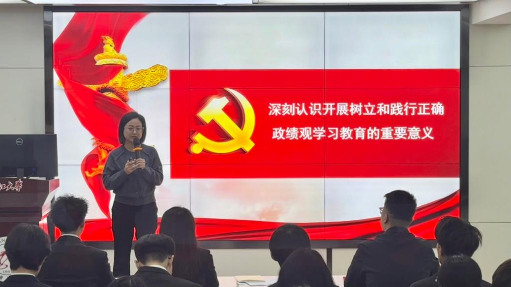 培训第一部分,学院党委副书记贾彩鑫带领学员以“树立和践行正确政绩观”为主题展开学习,她首先系统阐释了习近平总书记关于育人事业建设的九大核心原则,为学员明晰了工作方向与根本遵循,随后,她详细讲解了教育强国建设规划纲要的长远目标与阶段性成果,引导全体学生党员深刻认识开展正确政绩观学习教育的重要意义,强调要自觉以正确政绩观校准思想和行动,积极响应国家号召,将“塑造立德树人新格局”作为首要任务,以实际行动推动学院高质量发展,以一言一行彰显党员的先锋模范作用,用青春担当与实干实绩,为学院事业发展、教育强国建设贡献力量、添砖加瓦。