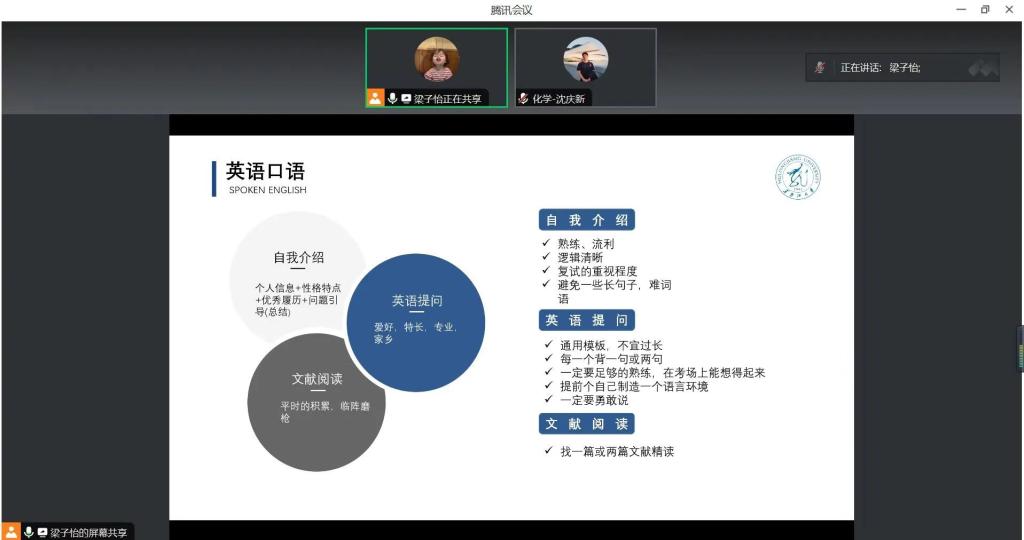 首先,梁子怡同学向大家分享了她在复试过程中的经验和心得。详细介绍了复试的评分标准、专家组面试的具体要求,以及复试的时间、地点和所需准备的材料等信息,并着重介绍了老师提问和文献阅读两种英语考核方式,建议同学们分类掌握一些通用模板,同时做好文献阅读的平时积累。这些经验使同学们对复试有了更深入的理解,并能够有针对性地进行准备。