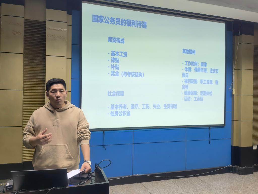 解读会伊始,沈庆新详细介绍了国家公务员的福利待遇。从稳定且结构合理的薪资构成,包括基本工资、津贴、补贴和与考核挂钩的奖金,到全面的社会保障体系,如基本养老、医疗、工伤、失业和生育保险,以及住房公积金等,全方位地展现了公务员岗位在经济保障方面的优势。此外,像规律的工作时间、带薪年假、法定节假日以及职工食堂、宿舍等福利设施,还有定期体检和工会活动等额外福利,也让毕业生们清晰地认识到公务员岗位在生活保障和工作生活平衡方面的吸引力。