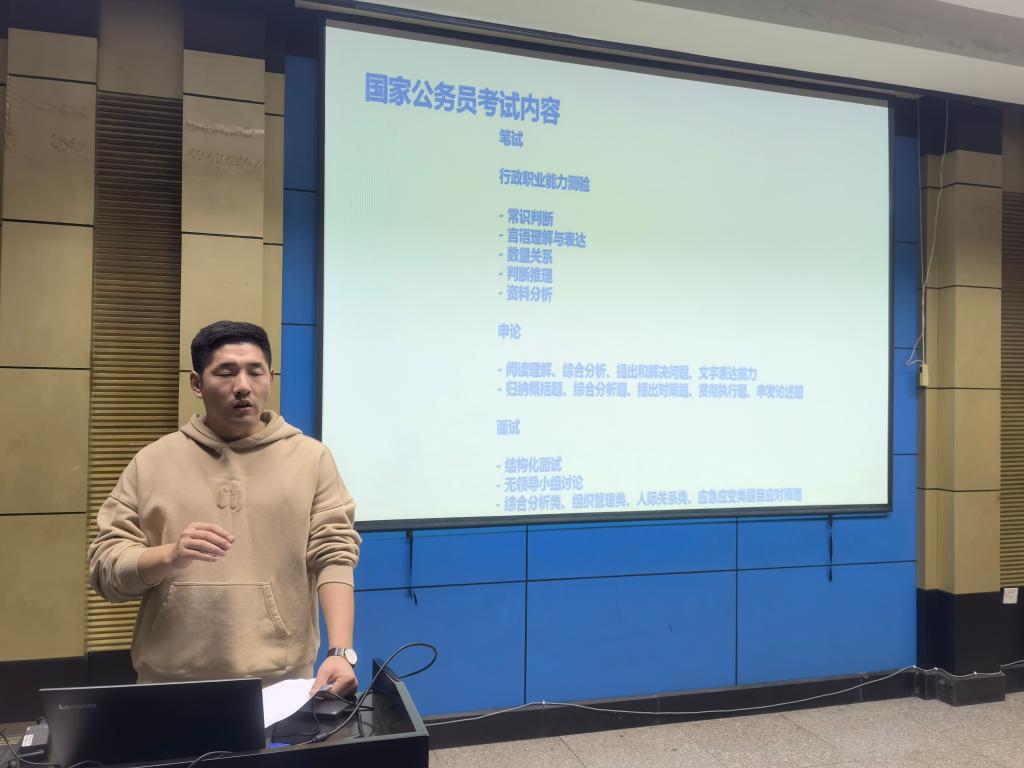 为帮助毕业生深入了解2024年国家公务员考试政策,为其备考之路点亮明灯,化学化工与材料学院2023年9月10日在化学楼234大会议室面向全体2024届考公毕业生举办了一场全面且细致的国家公务员考试政策解读会。此次解读会由2024届毕业生辅导员沈庆新围绕福利待遇、工作内容、考试内容、筛岗要点以及备考注意事项等核心内容展开,为毕业生们提供了丰富而实用的信息。