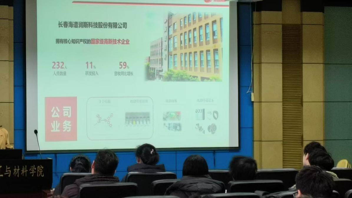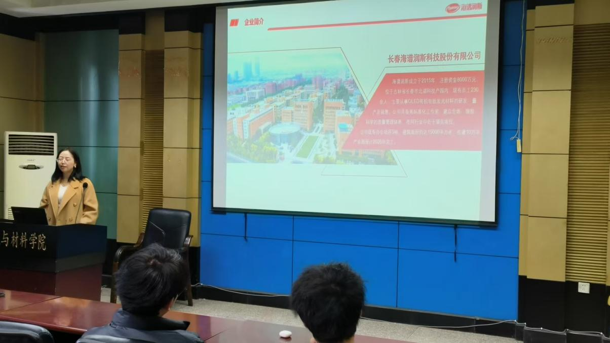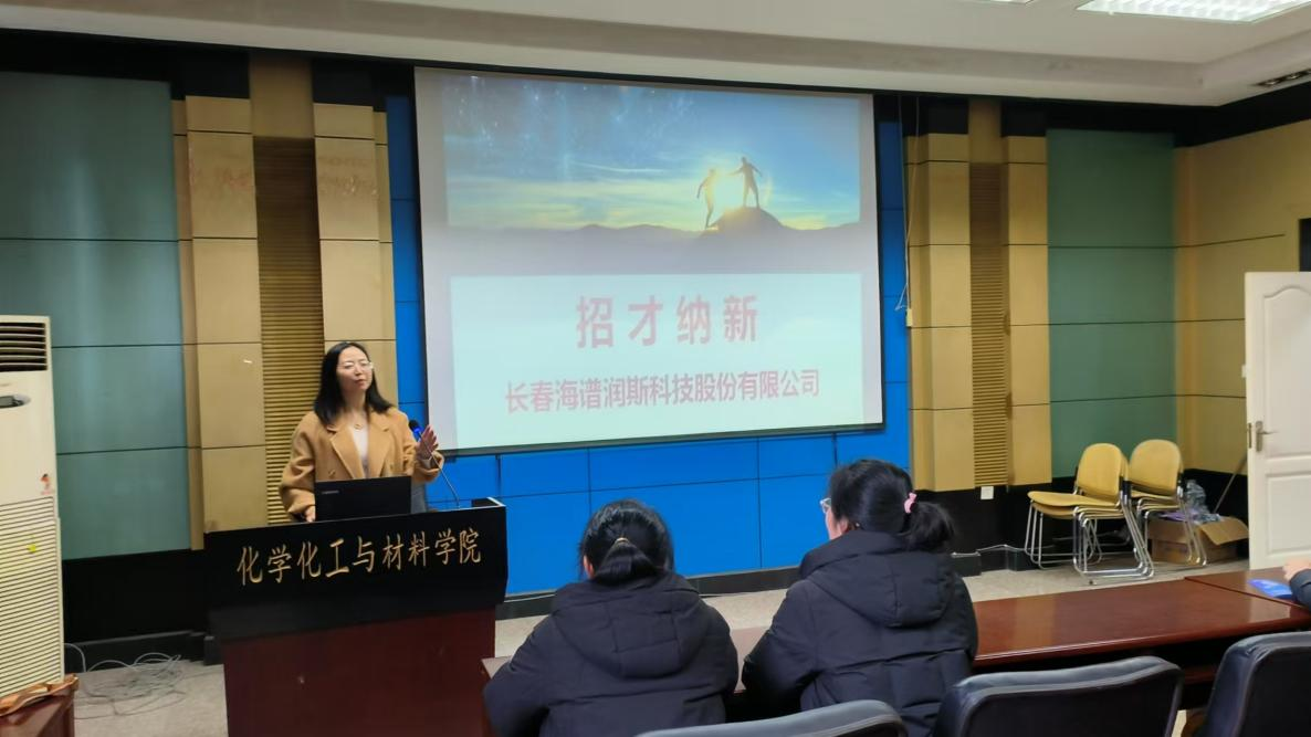 为持续提升学生就业竞争力,深化产教融合,推动学生高质量就业,化学化工与材料学院于2024年12月4日13:30在化学楼大会议室举办长春海谱润斯科技股份有限公司企业专场宣讲会。本次招聘会由该公司人力资源负责人宫航主讲,2025届本、硕、博毕业生参加。
