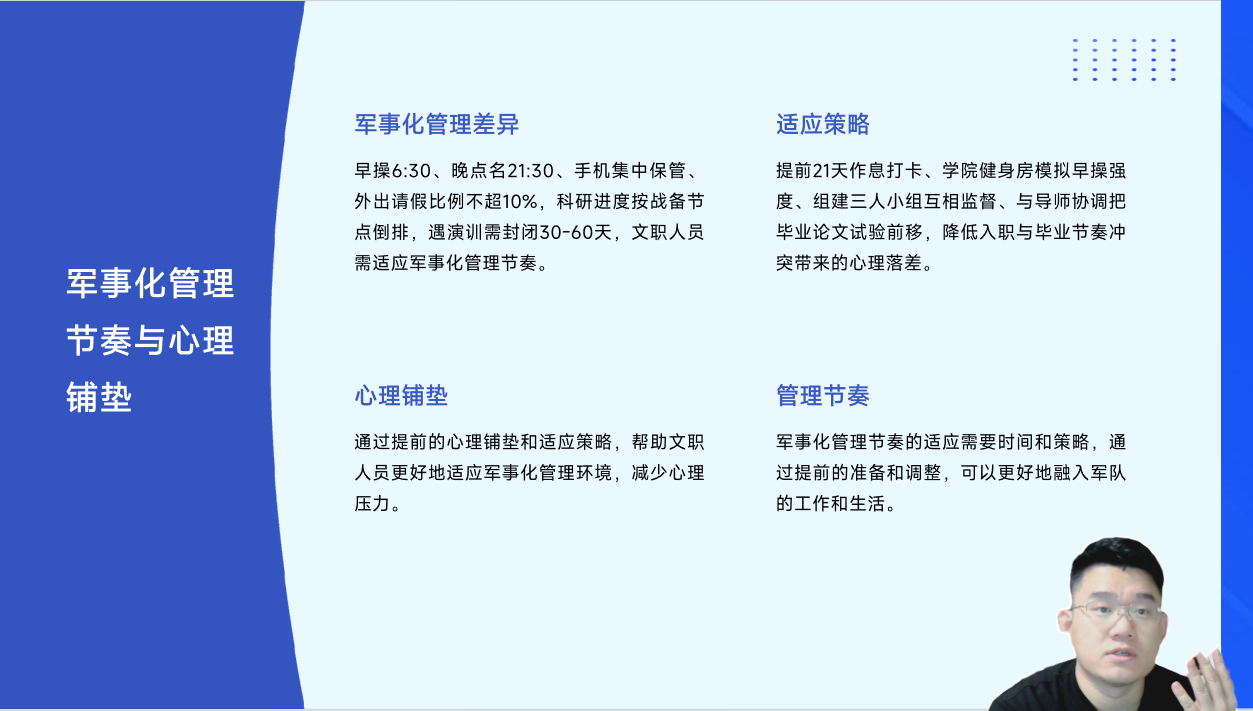 培训中,王增泽老师全面解读了军队文职人员的身份性质、职业定位与发展前景。他详细介绍了2025年部队文职人员的招考对象、报考条件、年龄与学历要求,并重点梳理了网上报名、资格初审、统一笔试、面试体检等全流程环节。王老师结合学院专业特色,分析了军队在化学分析、材料研发、环境监测等方向上的文职岗位需求。他还客观分析了部队文职工作纪律严格、使命光荣的职业特点,引导同学们根据自身情况理性选择。