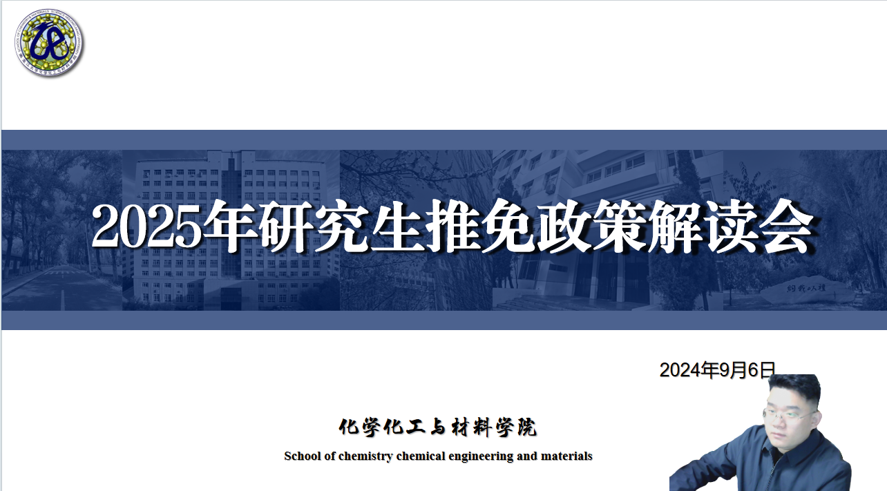 此次推免政策解读会的召开,推进了2025届学生推免工作的顺利开展,使同学们对推免政策有了更加清晰深入的认识,对激发学生的学习动力,助力学生保研,明确今后的努力方向都具有重要意义。(化学化工与材料学院供稿)